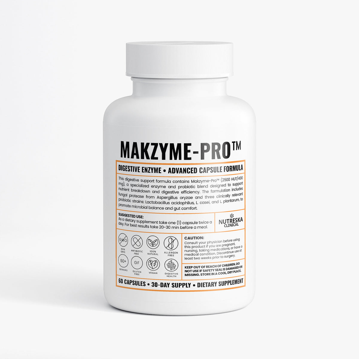 Makzyme-Pro™, Enzyme Blend (Fungal Protease from Aspergillus oryzae, Lactobacillus acidophilus, Lactobacillus cases, Lactobacillus plantarum), Bromelain, Papain, Fungal Lipase, Fungal Lactase, Alpha Galactosidase, Hypromellose (vegetable capsule), vegetable Magnesium Stearate, Silicon Dioxide.