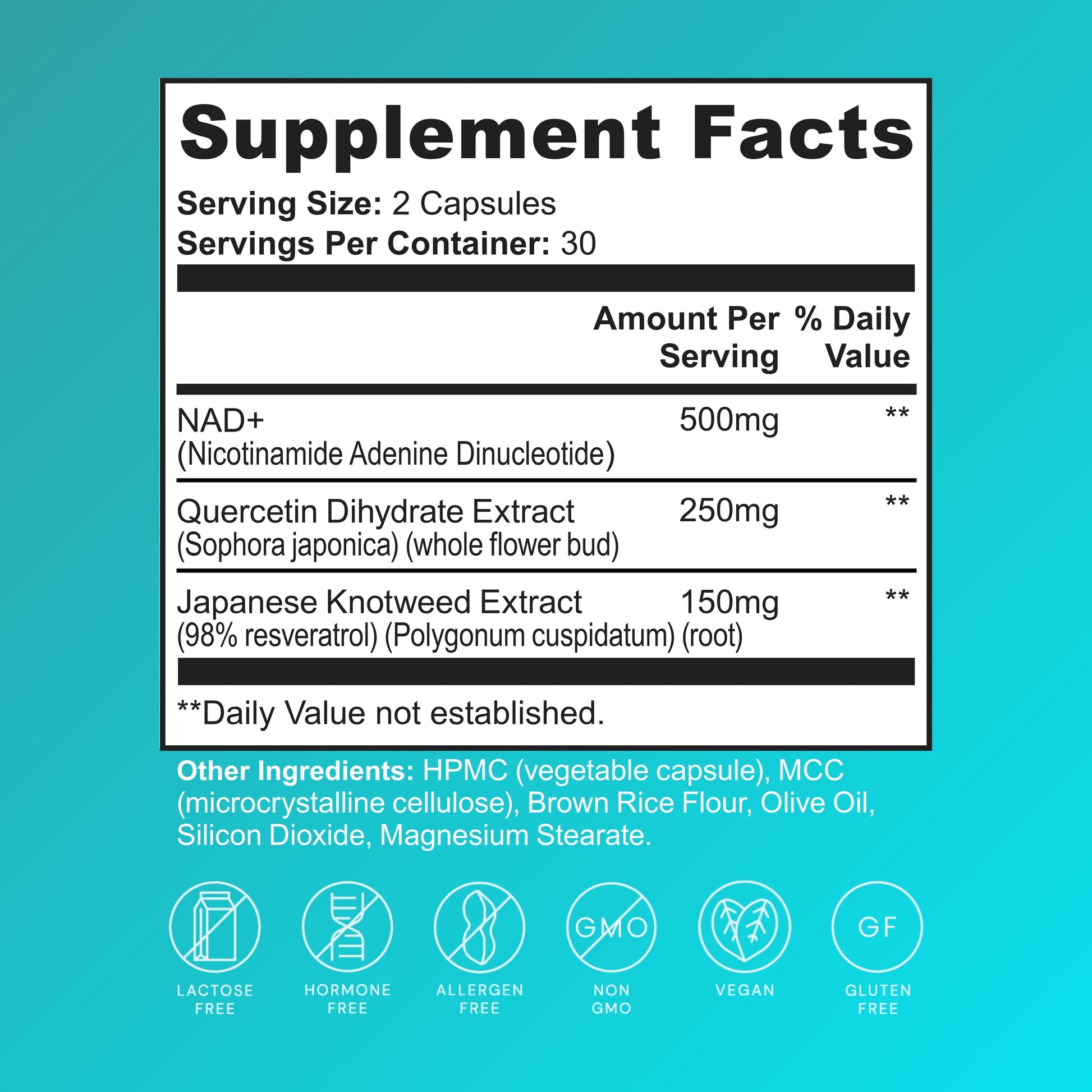 NAD+ (nicotinamide adenine dinucleotide) is the universal fuel that powers every mitochondrion in every cell you own. It turns calories into ATP, activates DNA-repair enzymes, and flips on sirtuins—the “longevity switches” that help keep cells youthful. Yet by your mid-30s NAD+ levels can drop by 50 %, starving your biology of the spark it needs to repair damage and create energy. Supplementation restores that spark with a 500 mg dose of pure NAD+, then fortifies it with Quercetin (a senolytic flavonoid that helps clear sluggish “zombie” cells) and Resveratrol (the celebrated red-wine polyphenol that supports heart, brain, and endothelial health). The trio works in concert to recharge mitochondria, calm age-related inflammation, and defend DNA integrity—laying the biochemical groundwork for a longer health-span and a life that feels decades younger.*